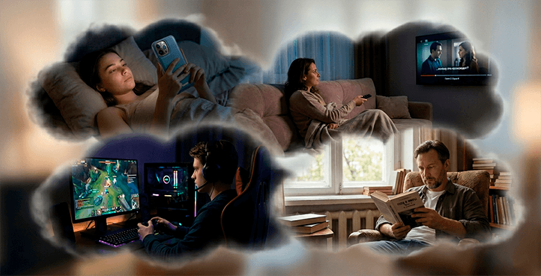 В последние годы всё чаще можно наблюдать и другие способы ухода от реальности. Кто-то погружается в виртуальный мир, компьютерные игры, сериалы, социальные сети. Кто-то уходит в книги, поглощая одну за другой, пытаясь заполнить внутреннюю пустоту. Формально человек живёт, но внутренне он всё меньше присутствует в собственной жизни.